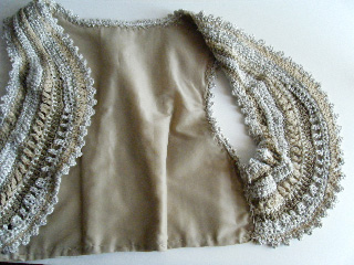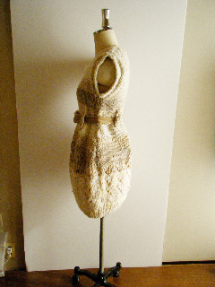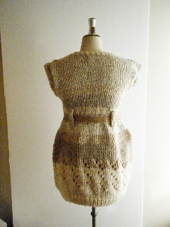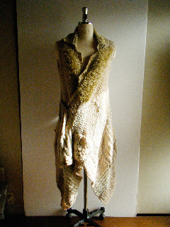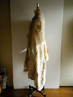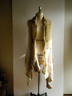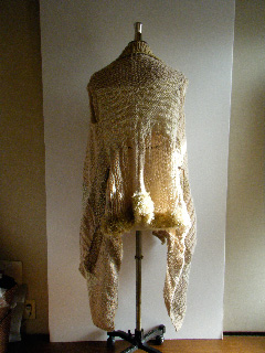 ウール、麻、綿などミックス、編み地も色々混ぜています。軽くて温かい。